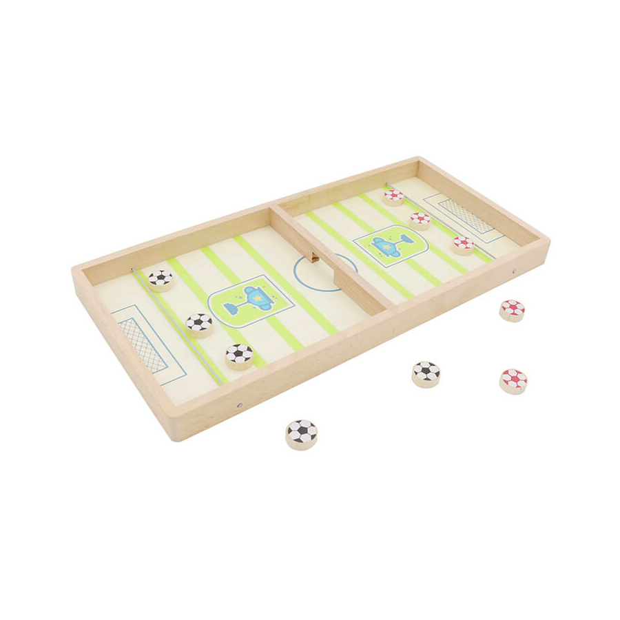 Fából készült foci táblajáték 10 darab koronggal. A játékban egyszerre 2 játékos vehet részt, mindenkinek 5 darab korongja van. A feladat lényege átjuttatni minden korongot az ellenfél oldalára a táblán található gumi segítségével. Az a nyertes, akinek hamarabb lesz üres a pályája. Remek pörgős, szórakoztató játék, mely fejleszti a kézügyességet, a logikát és a gyors reakciót.