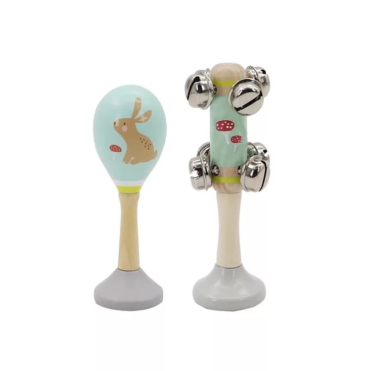 Fából készült festett ritmushangszer készlet, melyben 1db nyuszis rumbatök és 1 db gombás nyeles csörgő található. Lehetőséget nyújt a zenélésre olyan gyermekek számára is, akik még csak most kezdenek ismerkedni a gyerekhangszerekkel. Fejleszti a ritmusérzéket, a belső hallást, valamint a emlékező- és a alkotókészséget.