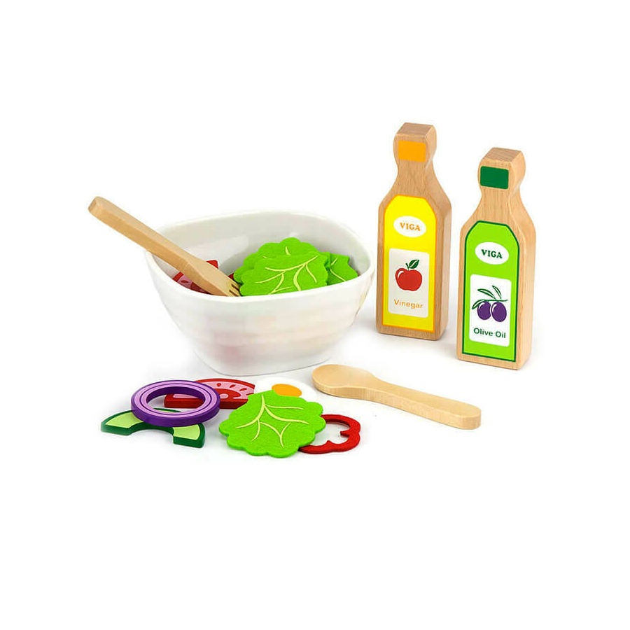 36 db-os salátakészlet. Zöldségek, szószok, salátástál, evőeszközök fából.
