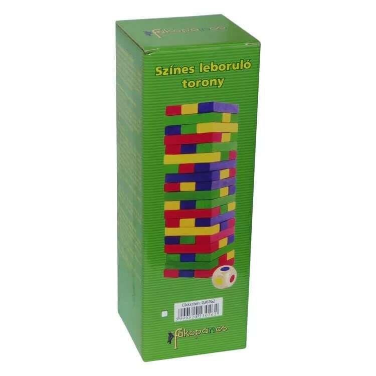 Színes leboruló torony Előkészület: Építsen tornyot a következő szerint. Helyezzen 3 téglalapot minden sorba úgy, hogy az egymást követő sorok 90 fokkal el legyenek forgatva (keresztbe). A játék: A játékosok felváltva húzzanak ki egy téglalapot és helyezzék a torony tetejére. A győztes: Az első játékos, akinél a torony leborul, veszített. (kiesik) Az összes többi játékos újraépítheti a tornyot. Aki utoljára marad az a “túlélő” a győztes. Egyéb opciók: Azért, hogy nehezebbé tegye a játékot, használja a következő nehezítéseket: 1. Csak a szélére tegye a téglalapokat, amikor építi a tornyot, középre ne. 2. Csak egy kézzel játsszon. 3. Nem tehet több mint 2 téglalapot egy szintre a torony tetején. 4. Csak olyan színű téglalapot húzzon ki amilyen színűt dobott a dobókockával.