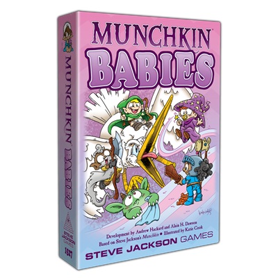 Munchkin Babies delivers 168 cards full of sweet, adorable baby adventurers . . . who are just as good at backstabbing and loot-grabbing as their elders from Munchkin. Play a cute Orcling, Dwarfling, Elfling, or Quarterling (half a Halfling). Go to preschool to learn your Class: Wiz Kid, Ankle Biter, Crumb Snatcher, or Holy Terror, and then arm yourself with the scariest items from the toy box: the Kazoo of Constant Whining, Kid-Safe Stabbinator, Blame-Resistant Pajamas, and of course, the Extremely Pokey Spoon. You must fight fearsome monsters such as the Jealous Kitty, the Hootin’ Nanny, the Napmare, and, worst of all, the Pediatrician! Grab their treasure and crawl your way to Level 10!