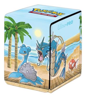 Surfs up with Pokémon Seaside Series Accessories! Ultra PRO’s Alcove Flip Deck Box for Pokémon features vibrant, full-color artwork featuring Gyrados, Lapras, and Magikarp. These deck boxes hold up to 100 double-sleeved cards and the dual thumb notches make it easy to remove your cards when you are ready to battle. The flip lid is secured shut with several strong magnets, ensuring cards are protected when not in use. This is the perfect addition to any Pokémon trainer’s collection!